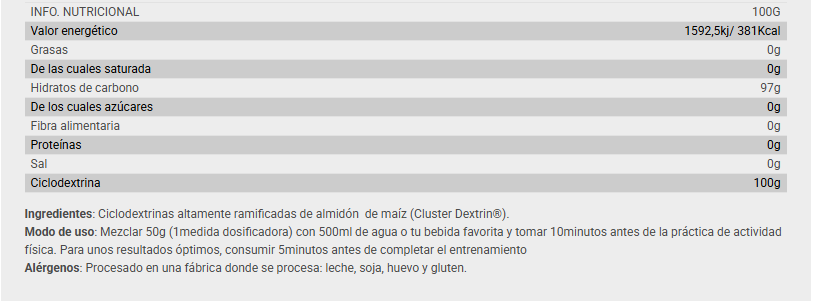 Descubre el poder de Cluster Dextrin Pure de Big® en su versión neutra, el carburante ideal para mantener tus energías al tope durante todo tu entrenamiento. Elaborado con la patentada Cluster Dextrin® de los prestigiosos laboratorios japoneses GLICO®, es la elección perfecta para un rendimiento sin igual.
