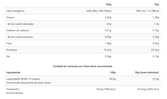 Este producto es fácilmente soluble y se puede consumir por personas intolerantes a la lactosa, ya que contiene Tolerase L-lactasa, una formulación especial de enzimas de lactasa que ayuda a mejorar la digestión de la lactosa presente en el suero.